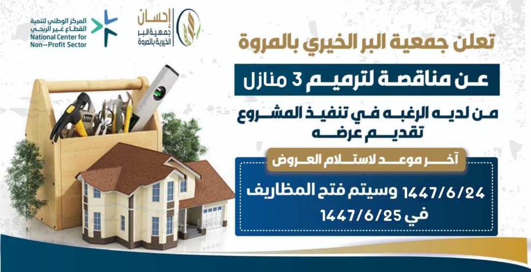 إعلان مناقصة تعلن جمعية البر الخيرية بالمروة عن مناقصة لترميم عشرة منازل